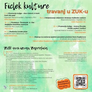 U travnju Zajednica u kulturi grada Zaprešića nastavlja sezonu uz ZUK-ov „ficlek kulture“. Iako su ovi dani posvećeni uskrsnom miru i vremenu s obitelji, upravo to ozračje koristimo i za proslavu kulture. Članovi ZUK-a u travnju donose nešto mirniji, ali birani kulturni sadržaj koji najavljuje dinamično proljeće u našem gradu.